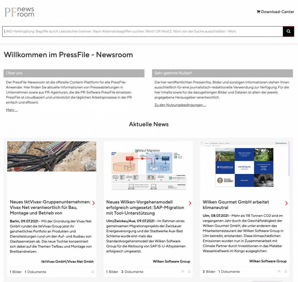 Pressetexte, alle dazugehörigen Bilder und Dokumente inklusive des zuständigen Ansprechpartners und seiner Kontaktdaten: All das können Anwender der PR-Software PressFile jetzt in einem Arbeitsgang veröffentlichen und für den personalisierten Mail-Versand bereitstellen. Der neue PressFile Newsroom erleichtert damit nicht nur die Publikation und Verteilung von Presseinformationen und Nachrichten, er kann auch zum individuellen Content Hub ausgebaut werden.