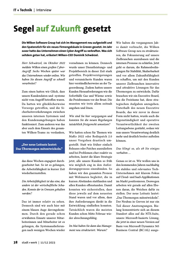 Im Frühjahr stellte sich die Wilken Software Group in Sachen Management neu auf. Im Herbst folgte der der Spatenstich für ein neues, großes Firmengebäude in Greven, direkt am Flughafen Münster/Osnabrück gelegen: Das Software-Unternehmen hat für die Zukunft einiges vor, so scheint es. Und das, obwohl Wilken vor einem Jahr einen großen Cyberangriff zu verkraften hatte. Was sich seitdem getan hat erläutert Wilken CEO Dominik Schwärzel im Gespräch.